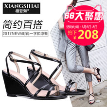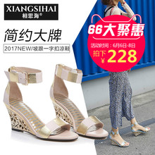 相思海2017韩版新款真皮百搭坡跟凉鞋女夏高跟一字带女甜美鱼嘴鞋