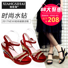 2017新款松糕简约水钻凉鞋女夏 坡跟防水台厚底黑色鱼嘴高跟鞋