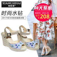 2017夏季新款真皮水钻坡跟女凉鞋松糕厚底防水台草编鱼嘴高跟鞋