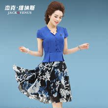 2016夏装新款雪纺假两件套连衣裙 气质大码短袖印花妈妈装长裙子