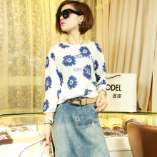 夏季青花瓷图案大花圆领长袖衬衣清爽小衫上衣女式韩版上衣