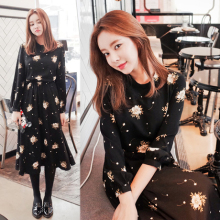 依随 新款长款连衣裙碎花复古显瘦长袖打底雪纺长裙系带A字裙
