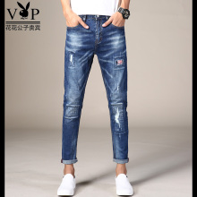 花花公子2017夏季九分牛仔裤潮男青年韩版修身小脚贴布绣休闲裤子