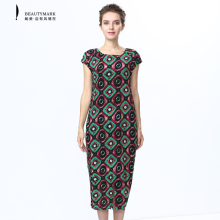 BeautyMark/飚美夏优雅气质显瘦褶皱绣珠弹性印花长袖连衣裙