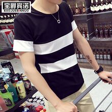 夏季新款男士短袖T恤青年学生修身条纹圆领半袖韩版男装打底衫潮