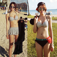 韩国波点小胸大胸比基尼泳衣女钢托聚拢黑白点裙子三件套泳装游泳