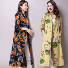 棉麻风衣2017春装新款民族风女装复古印花中长款一盘扣长袖外套女
