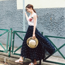UNIQUEWHO独角定制17春夏深蓝色星星绣花多层网纱蓬蓬高腰半身裙
