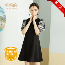a字连衣裙2017春季新款女雪纺拼接五分灯笼袖修身显瘦短裙小黑裙