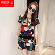 时尚套装女韩版修身显瘦2017夏装新款女装短袖短裤花色休闲两件套