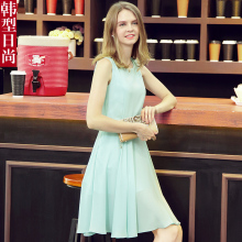 2017雪纺连衣裙春夏季长裙新款纯色中长款无袖收腰百褶裙沙滩裙