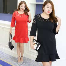 新款韩版加大码女装胖mm夏季鱼尾裙胖妹妹中袖烧花镂空显瘦连衣裙