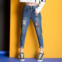 宽松直筒牛仔女韩版破洞卷边大码显瘦哈伦裤子女式休闲复古九分裤