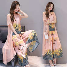 素选2017夏装新款套装气质名媛短袖雪纺衫七分阔腿裤印花三件套女