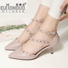 2017春夏新款韩版真皮包头高跟凉鞋女罗马尖头铆钉一字扣细跟单鞋