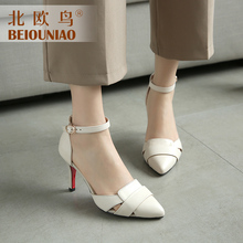 2017春夏新款韩版真皮包头高跟凉鞋女一字扣镂空尖头细跟工作单鞋