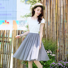 2017新款少女夏装连衣裙韩版修身学院风网纱短袖连衣裙初中学生女