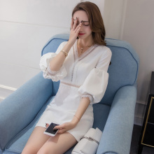 FEIYOU定制 春装2017新款女修身显瘦性感镂空V领七分灯笼袖连衣裙