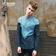 VIISHOW男士长袖衬衫牛仔蓝撞色拼接欧美潮男衬衣方领男式上衣服