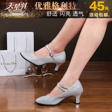 天星羽摩登舞鞋女成人银色中跟华尔兹舞蹈广场跳舞鞋软底交谊舞鞋
