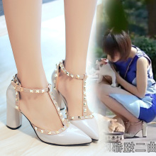 欢乐颂2曲筱绡同款尖头粗跟铆钉高跟鞋T字带包头凉鞋女夏2017牛皮