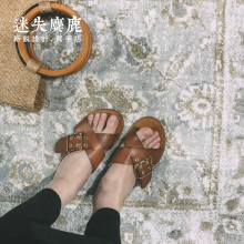 迷失麋鹿2017春夏款复古方头粗跟半拖鞋真皮外穿中跟凉拖鞋女夏
