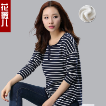 加肥加大码女装胖mm春装韩版宽松中长款打底衫条纹T恤长袖女上衣