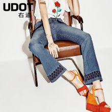 右道 复古刺绣流苏时尚棉麻牛仔裤女喇叭长裤子2017新品UU6070