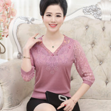 中老年女装春秋装中年妈妈装蕾丝纱袖T恤七分袖打底衫V领针织衫女