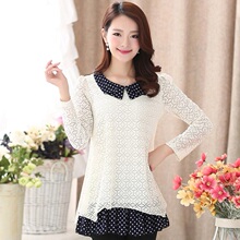2017春夏装大码假两件套蕾丝娃娃领打底衫中长款宽松雪纺衫女上衣