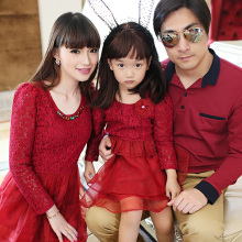 怡贝贝亲子装春装2017新款酒红蕾丝母女装一家三口女童连衣裙