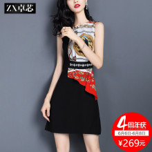 卓芯2017夏装新款宫廷风无袖印花连衣裙女夏修身显瘦中裙气质4455
