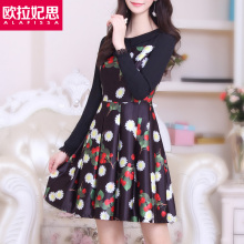 娃娃领女士裙子早秋季连衣裙长袖 气质2016新款大码女装印花中裙