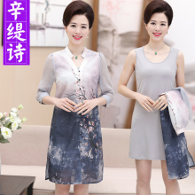妈妈春装大码中年女装雪纺开衫连衣裙2017夏装新款中老年两件套装