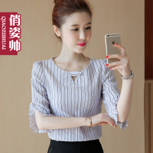 2017新款喇叭袖雪纺上衣夏装女装短袖衣服百搭条纹镂空雪纺衫短T