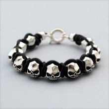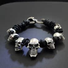 麻吉 925纯银骷髅大集合男士牛皮手链 个性编织手链 朋克暗黑手环