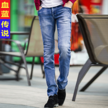 加长夏季浅天蓝色牛仔裤男超薄直筒修身弹力男士韩版潮牛仔裤男薄