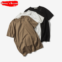 夏季纯色T恤男短袖韩版修身金属装饰破洞做旧日系潮流男士打底衫