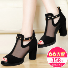 高跟鱼嘴鞋凉鞋女夏2017夏季新款网纱中跟粗跟韩版百搭春秋女鞋子