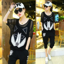 运动套装女夏2017夏装新款韩版胖mm宽松大码时尚哈伦裤网纱两件套