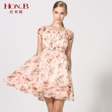 HONB红贝缇2016夏季新款修身显瘦碎花中长款印花雪纺连衣裙L52211