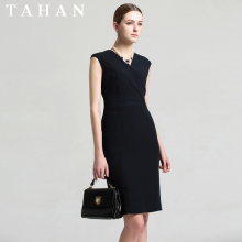 TAHAN太和春夏新款时尚气质女裙 OL职业感黑色连衣裙 极简V领修身