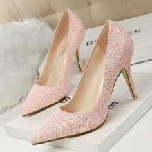 嘟市鞋柜韩版甜美时尚高跟鞋细跟高跟浅口亮片气质显修脚尖头单鞋