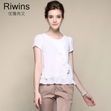 女雪纺衫短袖 2016夏装新款圆领荷叶边上衣韩版拼接小衫