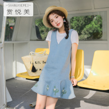 牛仔背带裙鱼尾裙学生女2017夏季新款连衣裙韩宽松中长吊带绣花裙