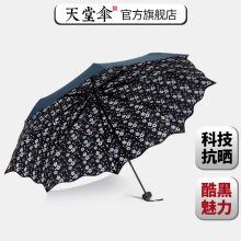 天堂伞旗舰店 防紫外线防晒伞遮太阳晴雨伞黑胶折叠伞女绣花伞
