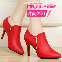 新款时尚尖头单鞋婚鞋红色新娘鞋子细跟女鞋水钻高套脚深口低帮鞋