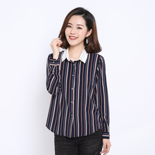 【新品】撞色条纹长袖衬衫女中年妈妈装修身显瘦春夏装雪纺衫上衣