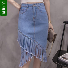 2017春夏新款不规则高腰牛仔裙女流苏A字半身裙显瘦百搭包臀短裙