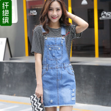 2017夏季新款韩版毛边高腰牛仔背带裙女显瘦吊带连衣裙学生a字裙
